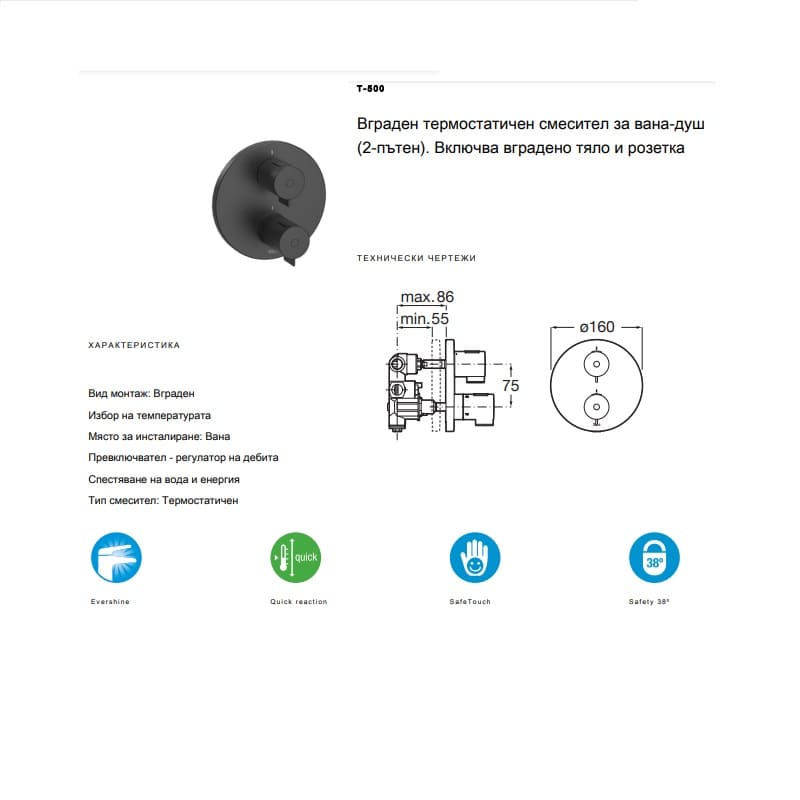 Вграден термостатичен смесител за вана-душ (2-пътен).